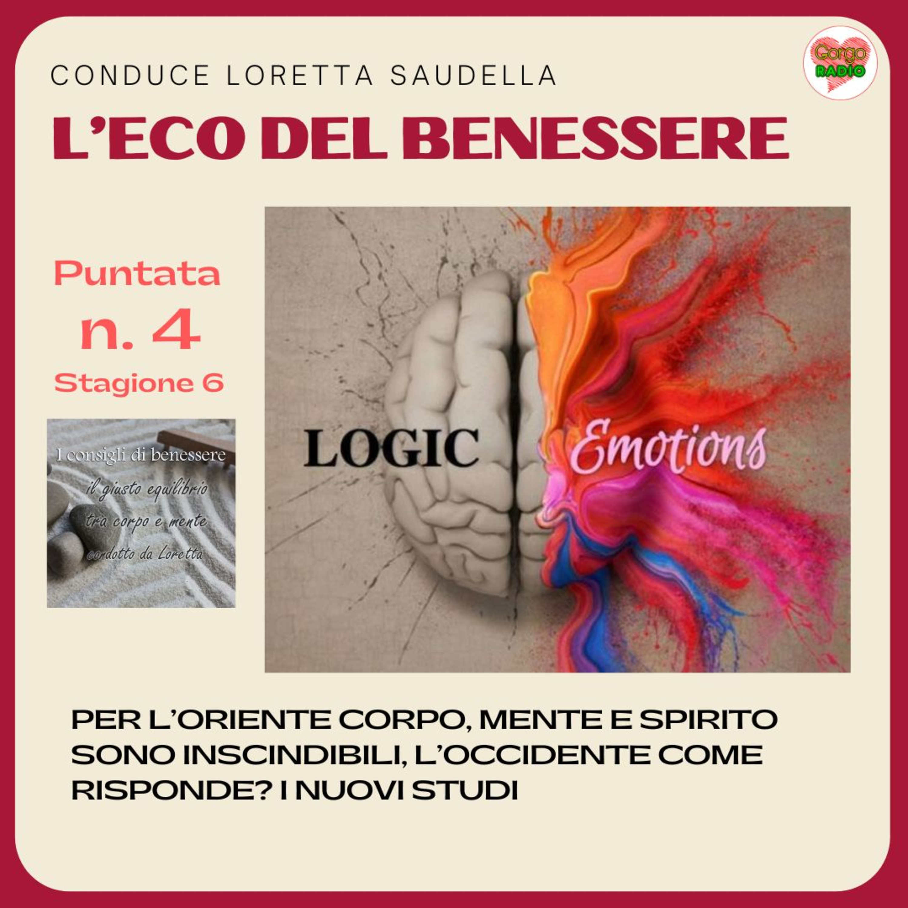 "Ben Essere", ogni settimana su Gorgoradio.it L’argomento della settimana è:per l’Oriente corpo, mente e spirito sono inscindibili, l’occidente come risponde? I nuovi studiVisita il sito di Loretta : https://www.lecodelbenessere.com/#lecodelbenessere#iconsiglidibenessere