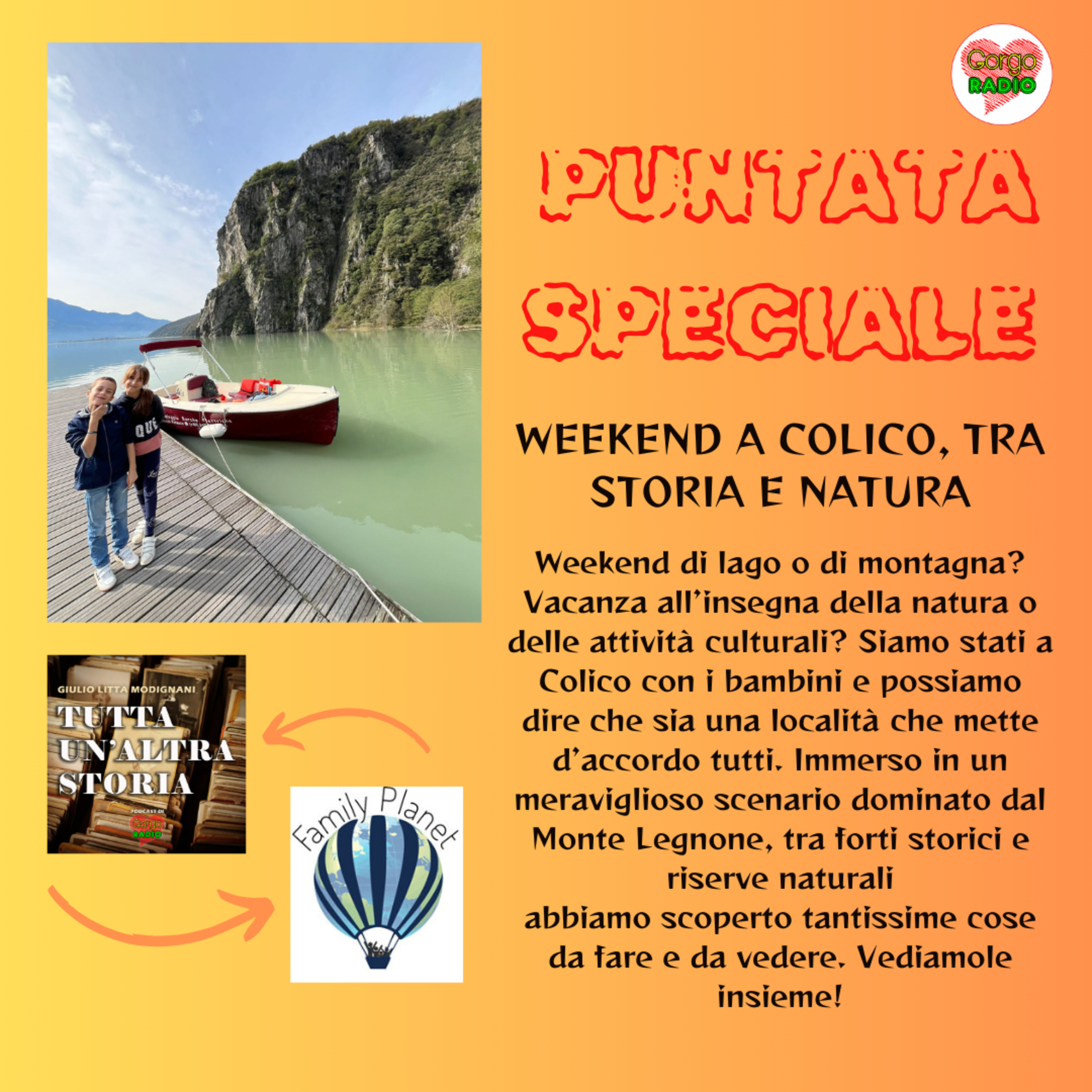 Un altro regalo di Gorgoradio con una puntata speciale di Family Planet condotto da Rossella Trupiano e Tutta un' altra storia condotto da Giulio Litta Modignani. Mix di storia e viaggi descrizione: Weekend di lago o di montagna? Vacanza all’insegna della natura o delle attività culturali? Siamo stati a Colico con i bambini e possiamo dire che sia una località che mette d’accordo tutti. Immerso in un meraviglioso scenario dominato dal Monte Legnone, tra forti storici e riserve naturali abbiamo scoperto tantissime cose da fare e da vedere. Vediamole insieme!